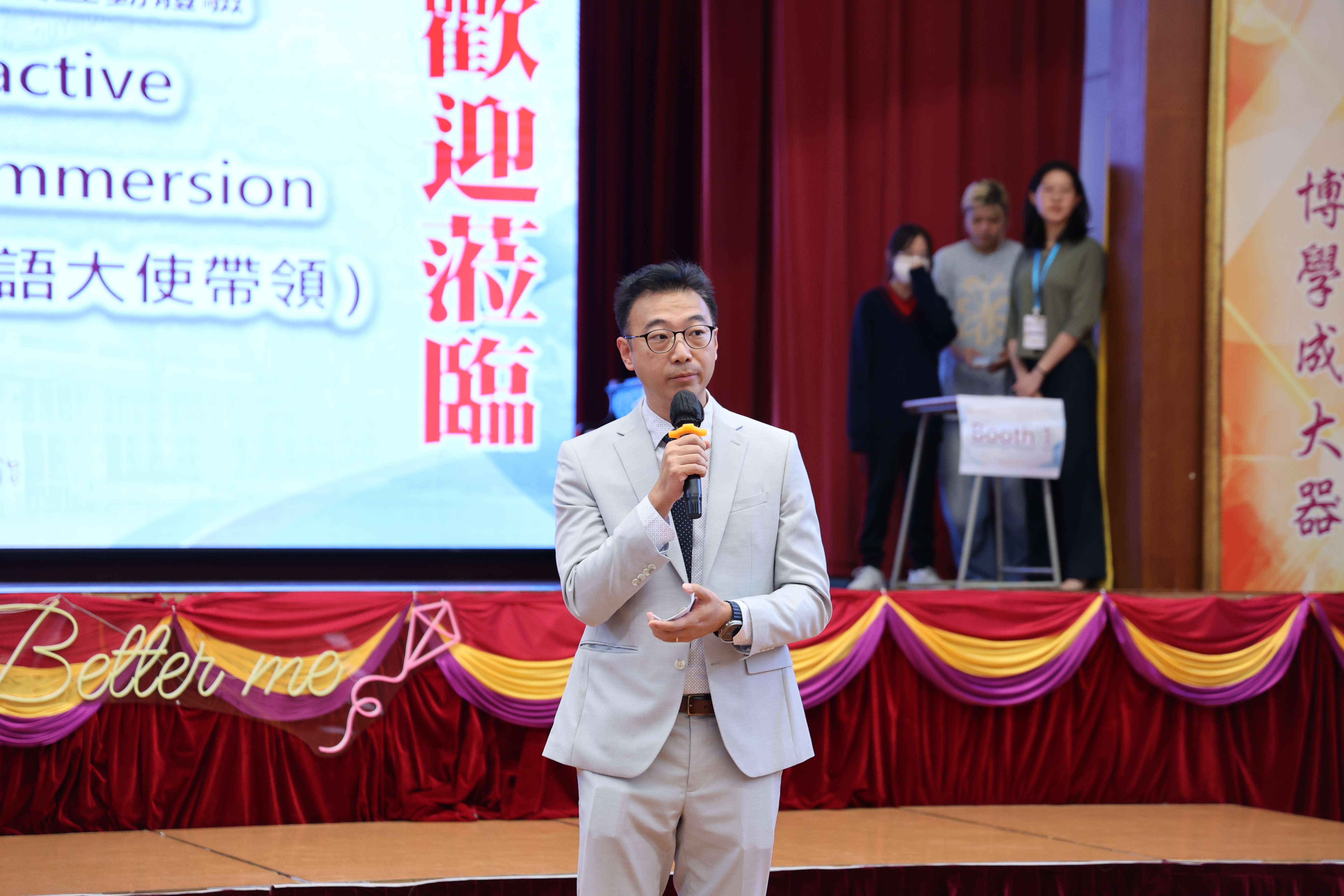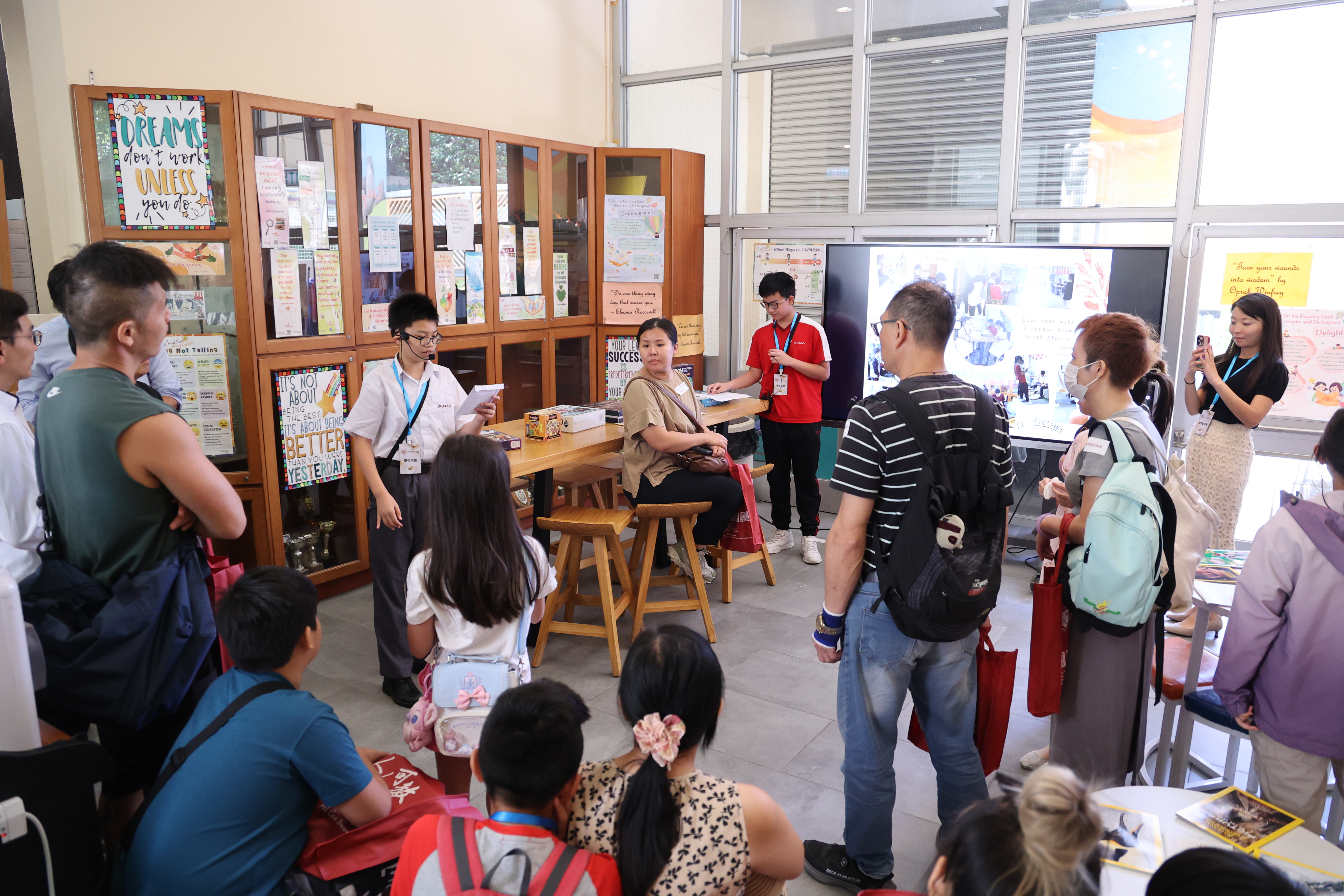 中一同學正在為家長介紹英語活動 |